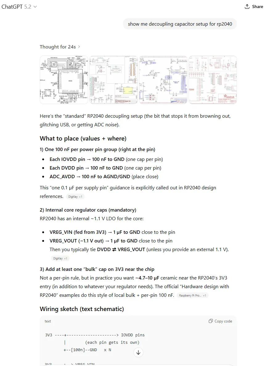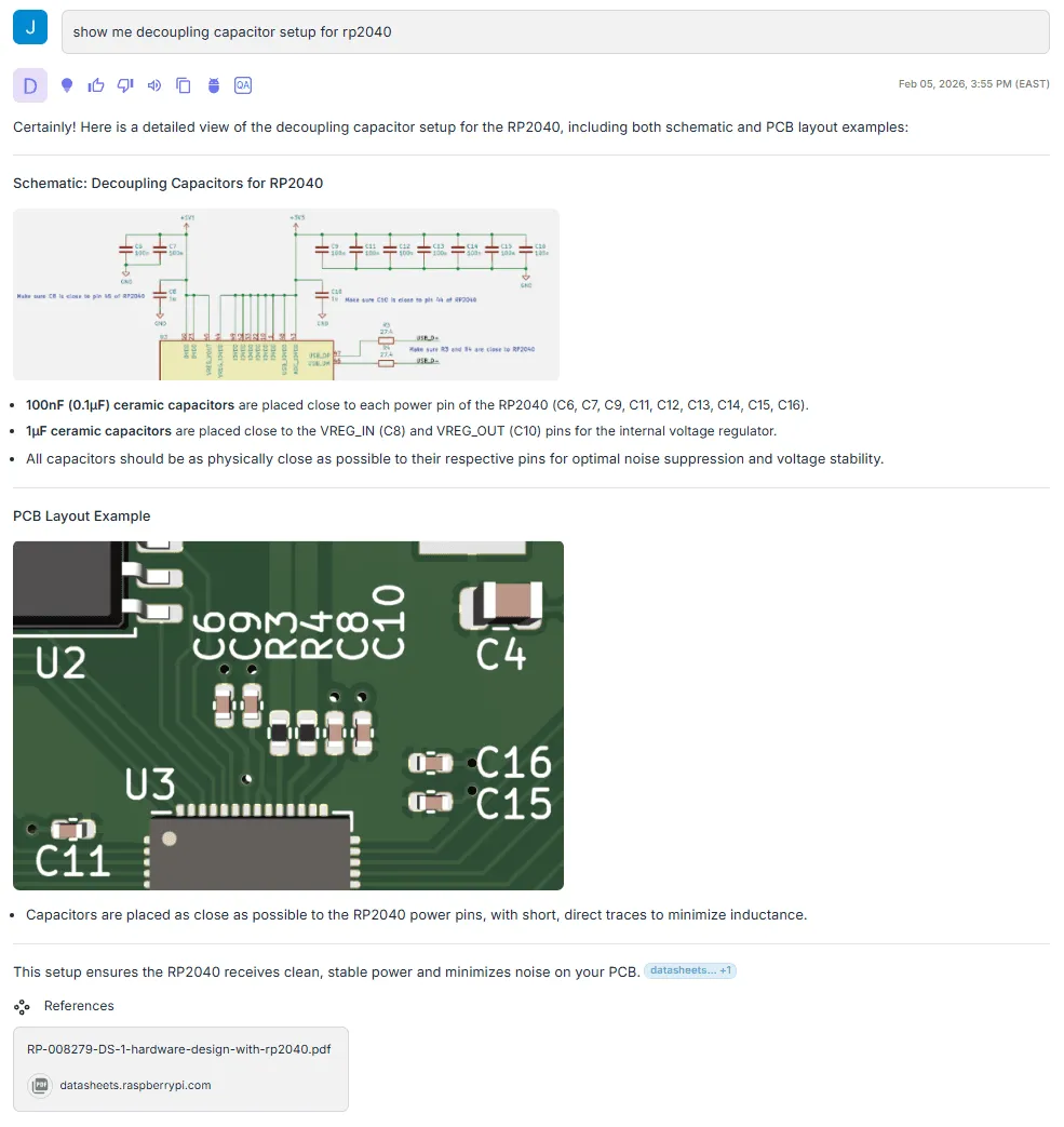 What’s notable here is that the response includes specific values taken directly from the schematic, not from surrounding text. In the referenced source, the capacitor values and annotations appear only in the image, yet the agent extracts them into structured text and returns the original visual as evidence. It also captures design intent embedded in the diagram, such as the note to place the 1 µF capacitors close to the device.