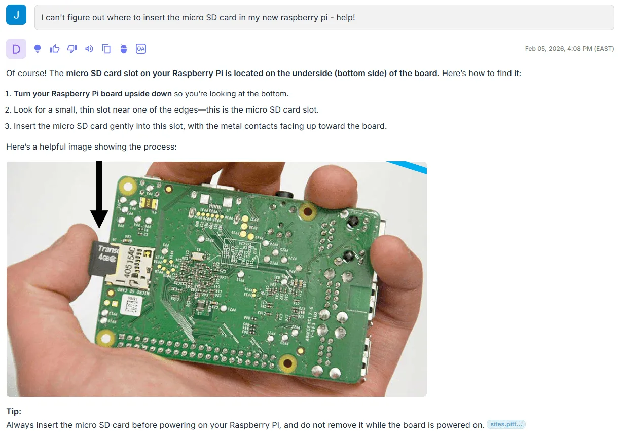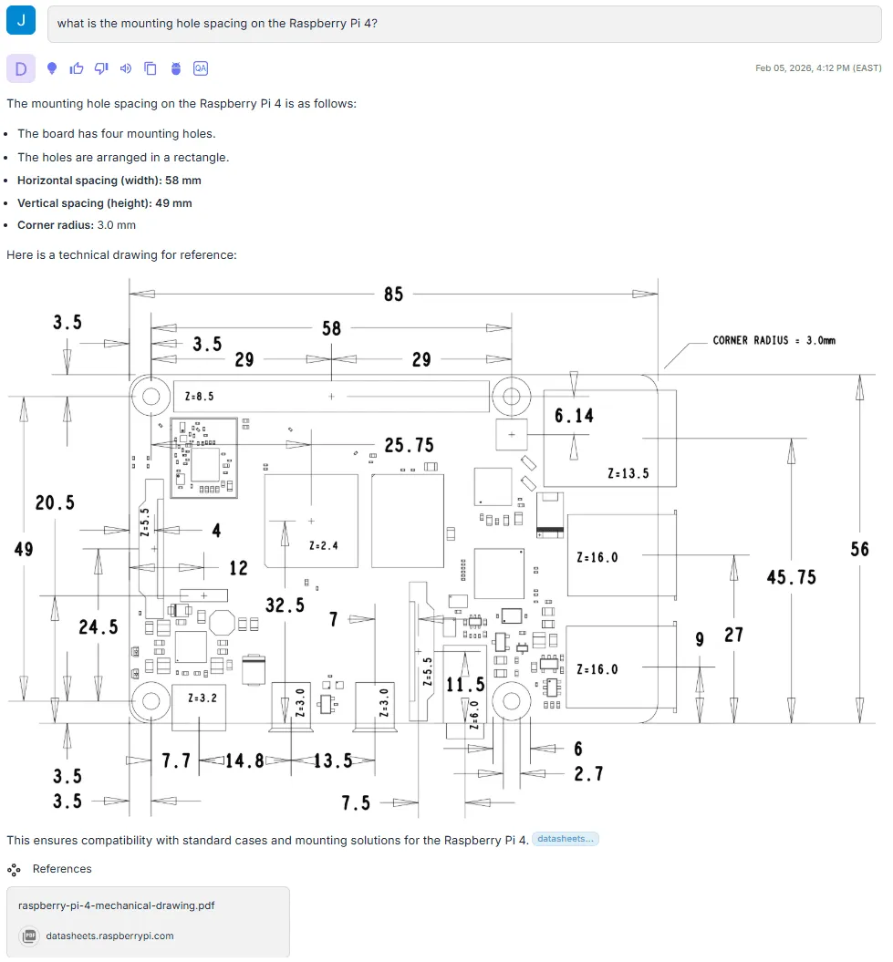 To illustrate why visuals matter for electronics queries, I ingested a public Raspberry Pi corpus, including datasheets, product guides, mechanical drawings, and educational slide decks, and ran a few representative queries across it.